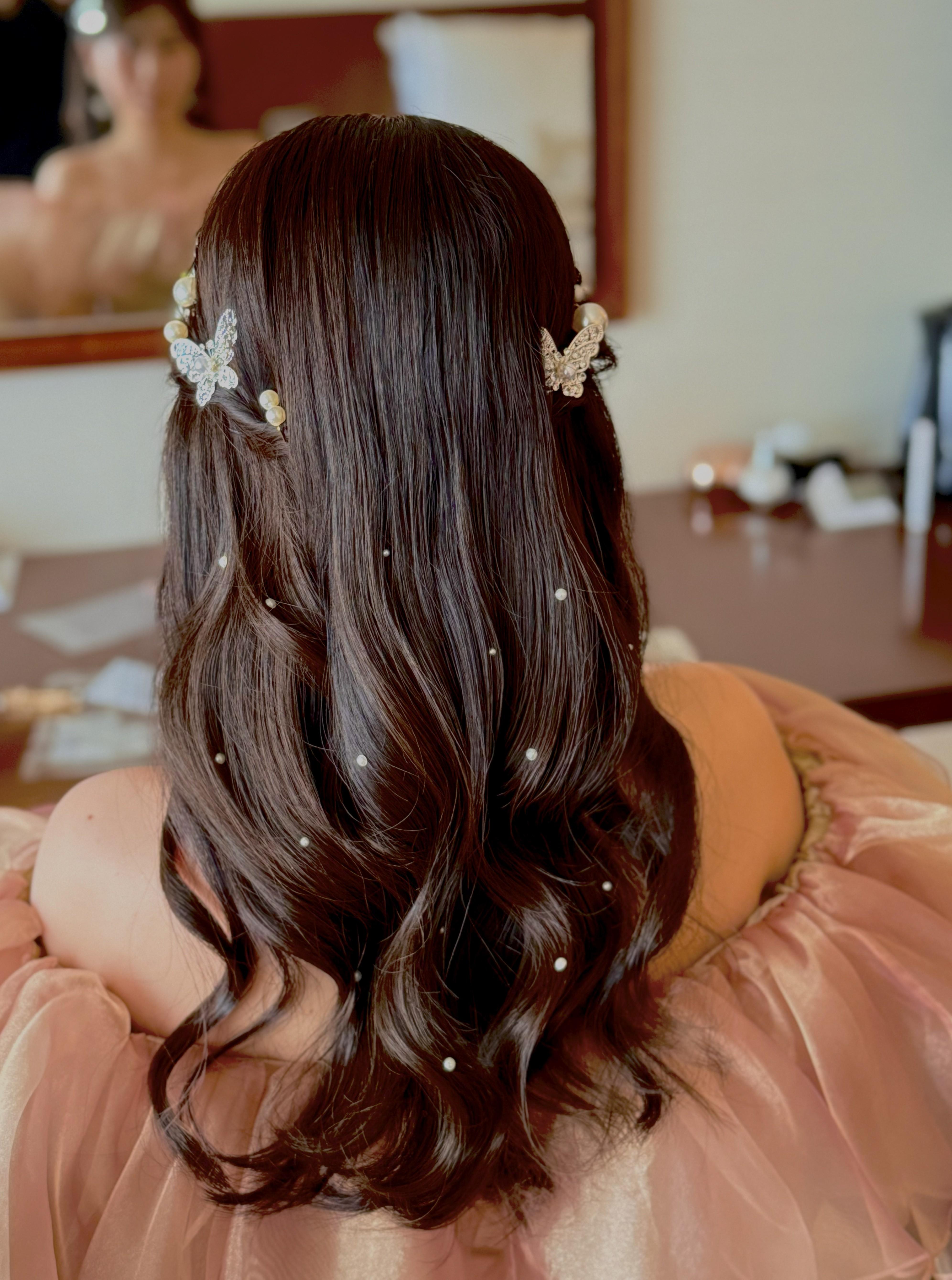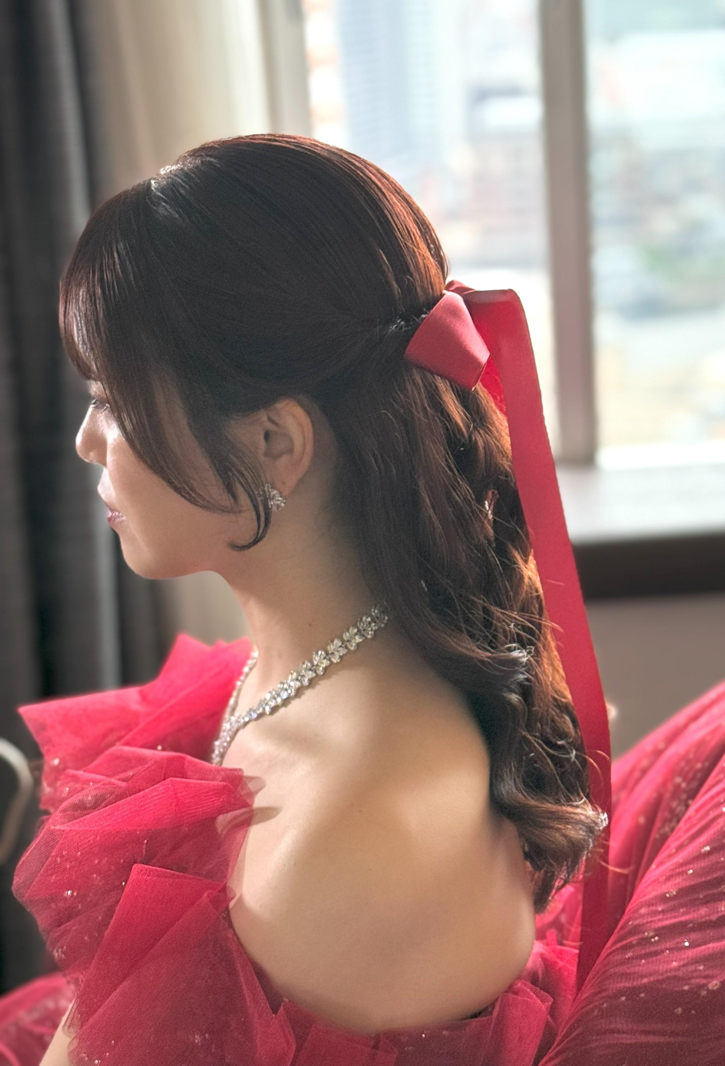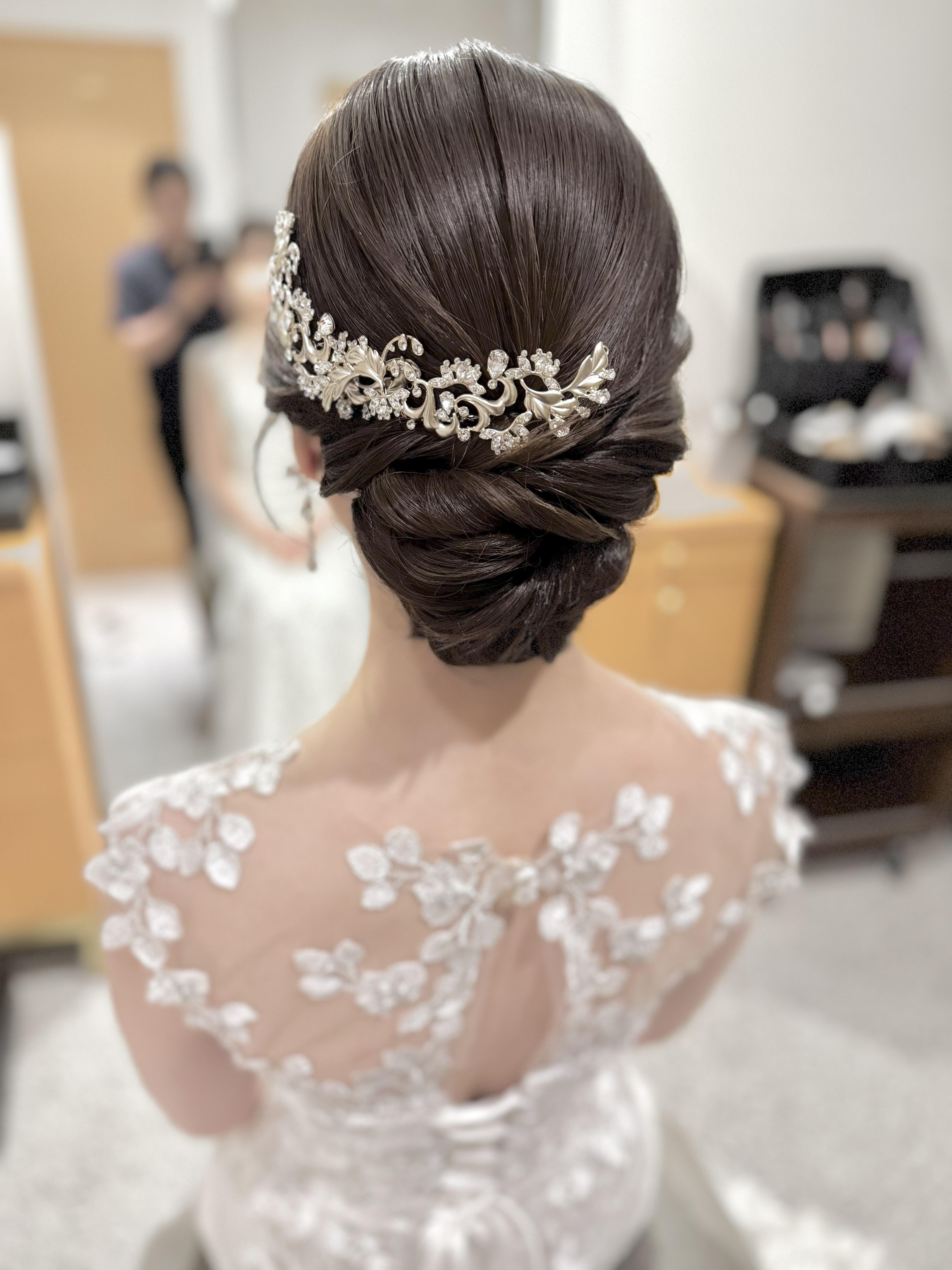 つややかなハーフアップ ゴールドのアクセサリーがポイント