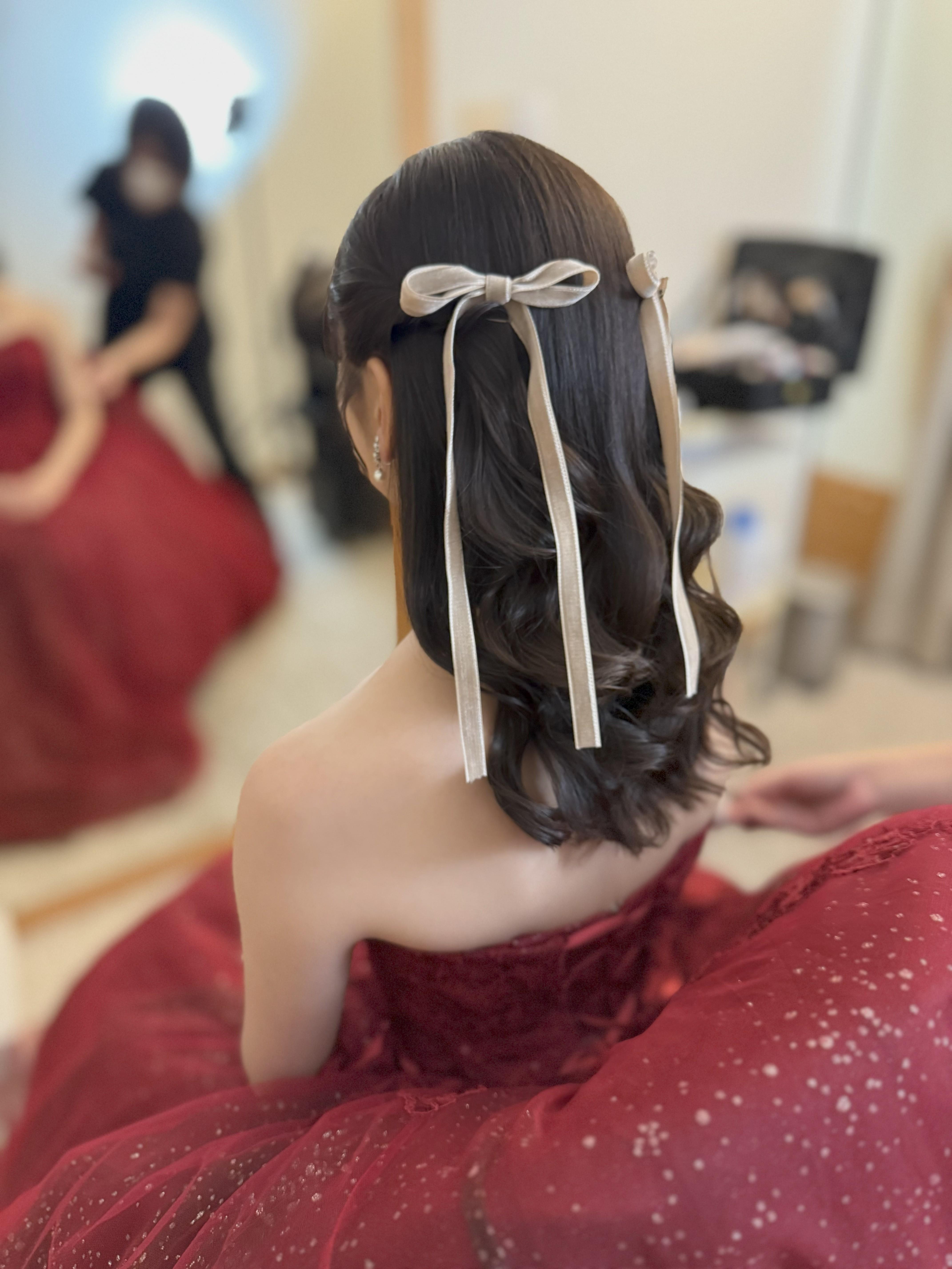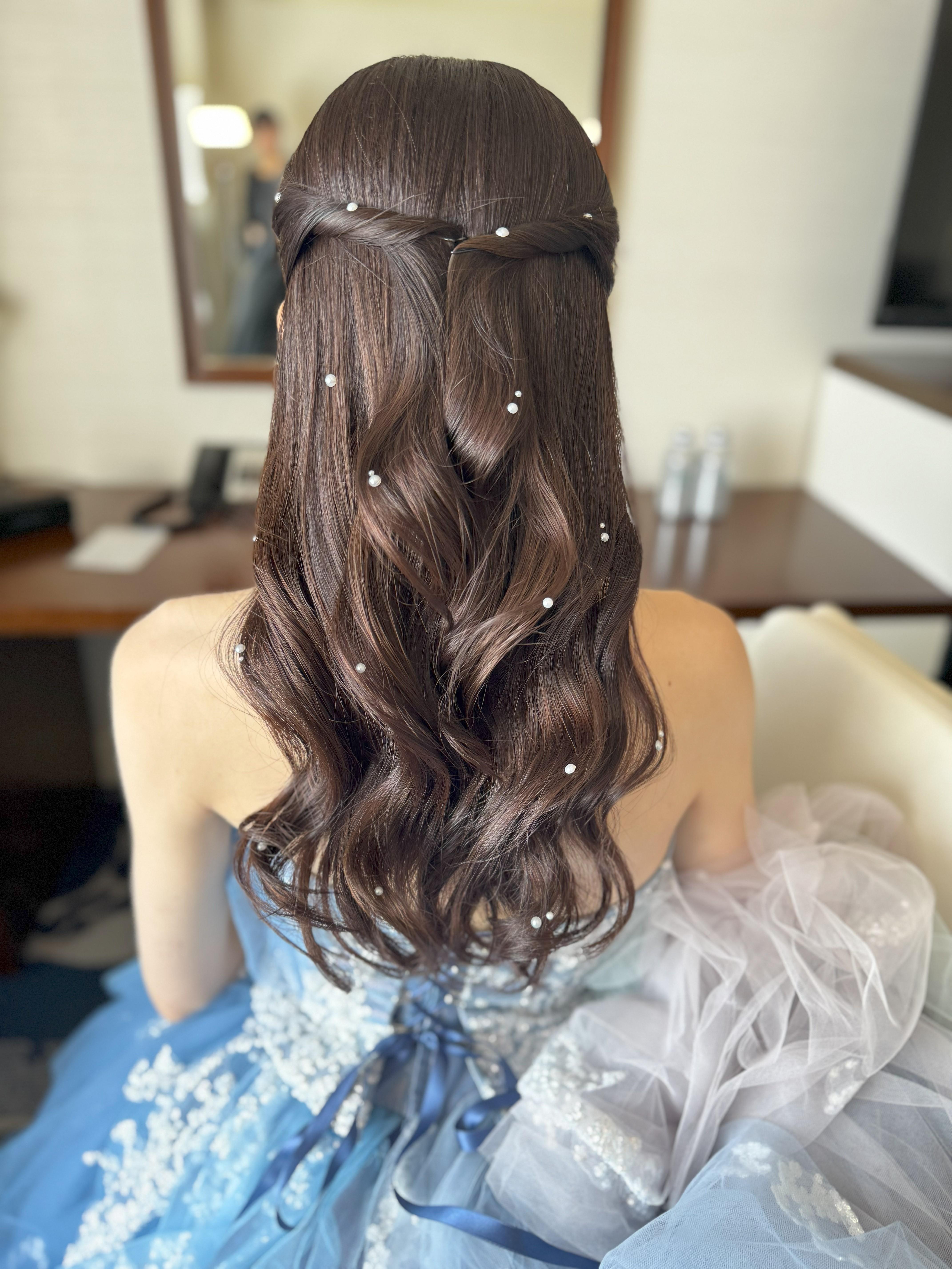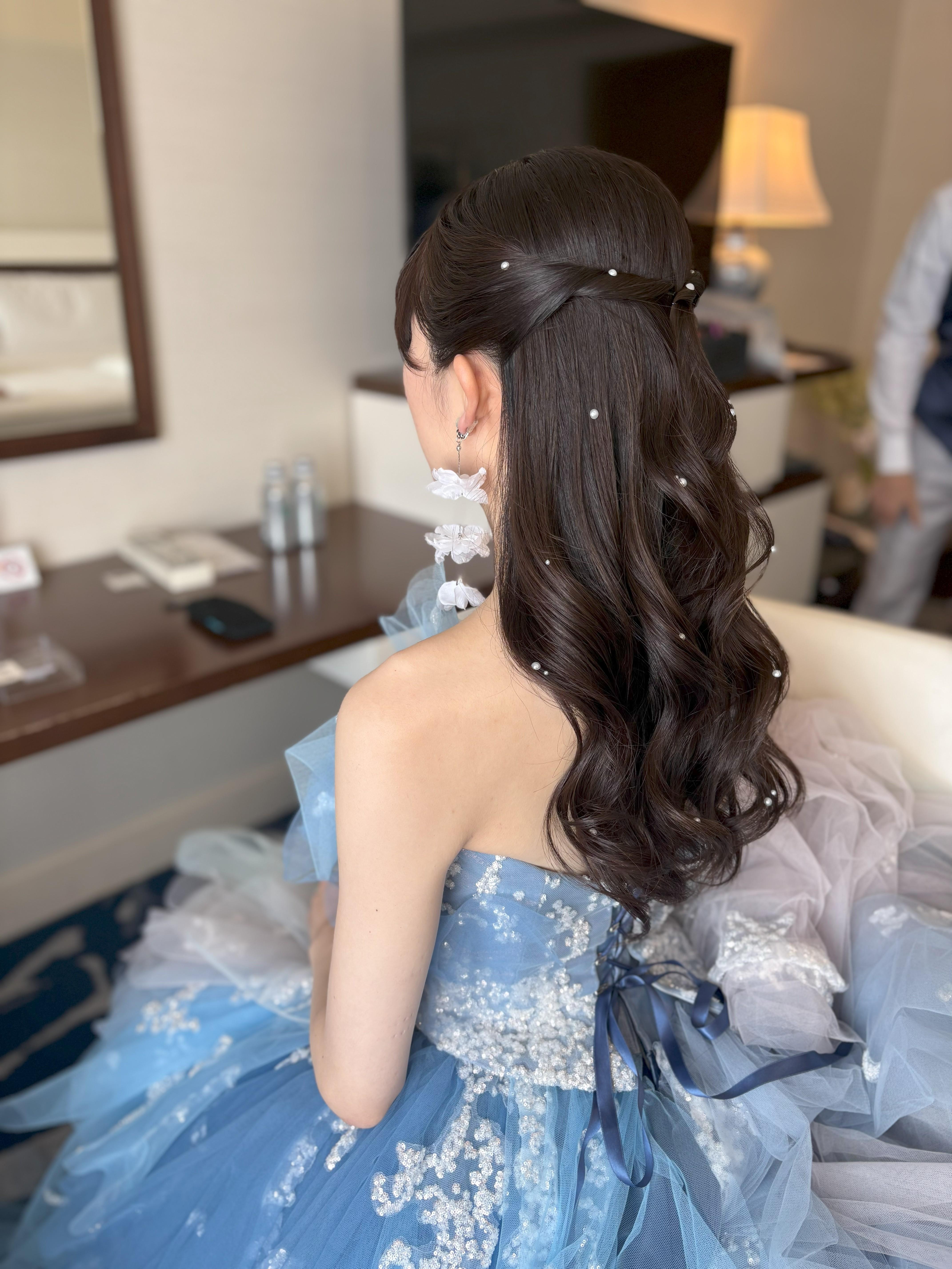 ゆるめウェーブハーフアップ。星のビジューとドレスが素敵